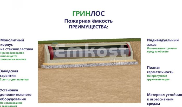 Характеристики Гринлос Пожарный резервуар 90-3000 стеклопластиковый